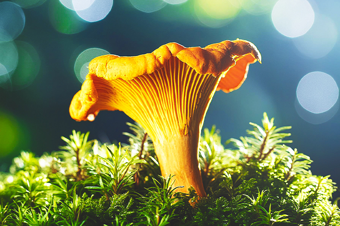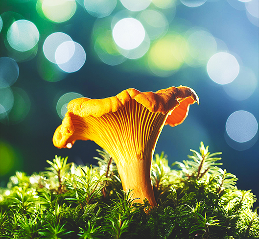 Blumen, Wälder, Blätter und Stämme sowie Pilze, Vögel und Insekten.